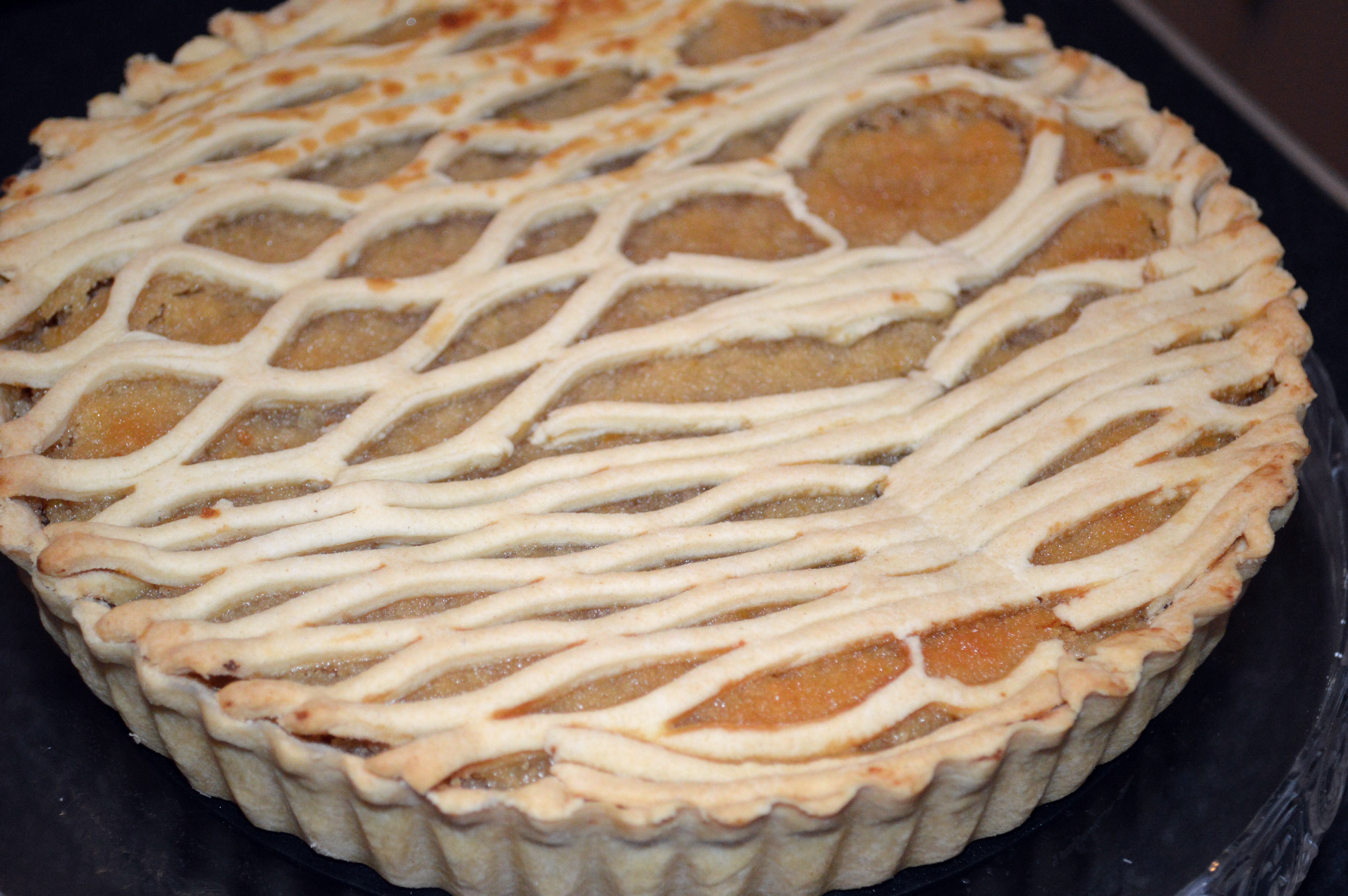 In a pastry pie shell and topped with pastry lattice